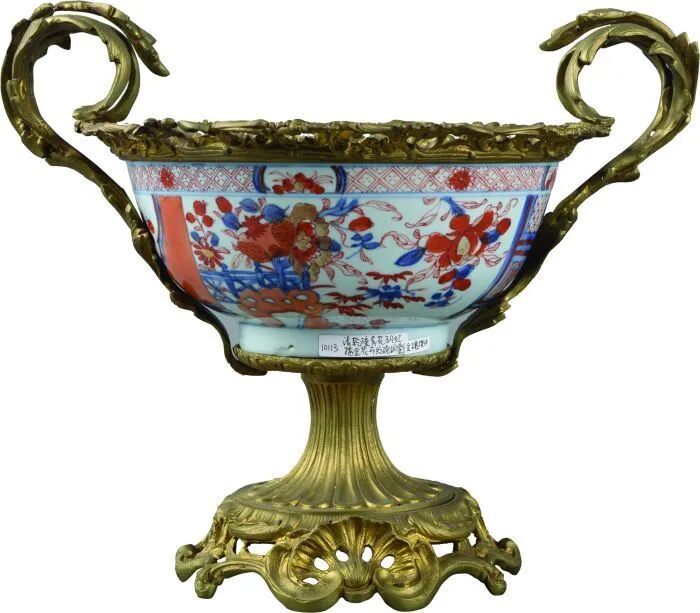 矾红描金花卉纹碗镶铜鎏金奖杯形摆件